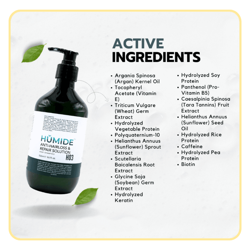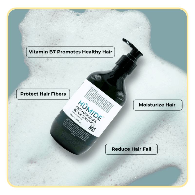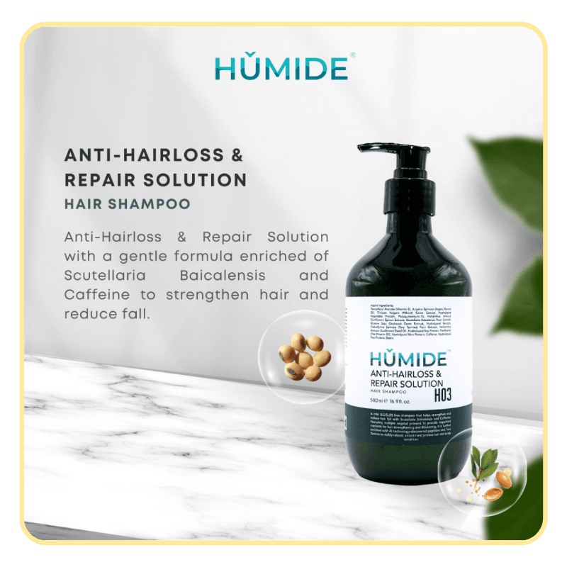 HUMIDE H03 – Anti-Hair Loss & Repair Solution Shampoo is a powerful daily formula that targets hair fall at the root level. Combining ancient herbal extracts with modern scalp science, it helps restore strength, shine, and density from your very first wash.